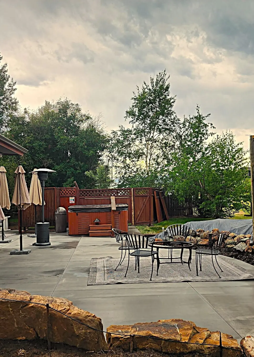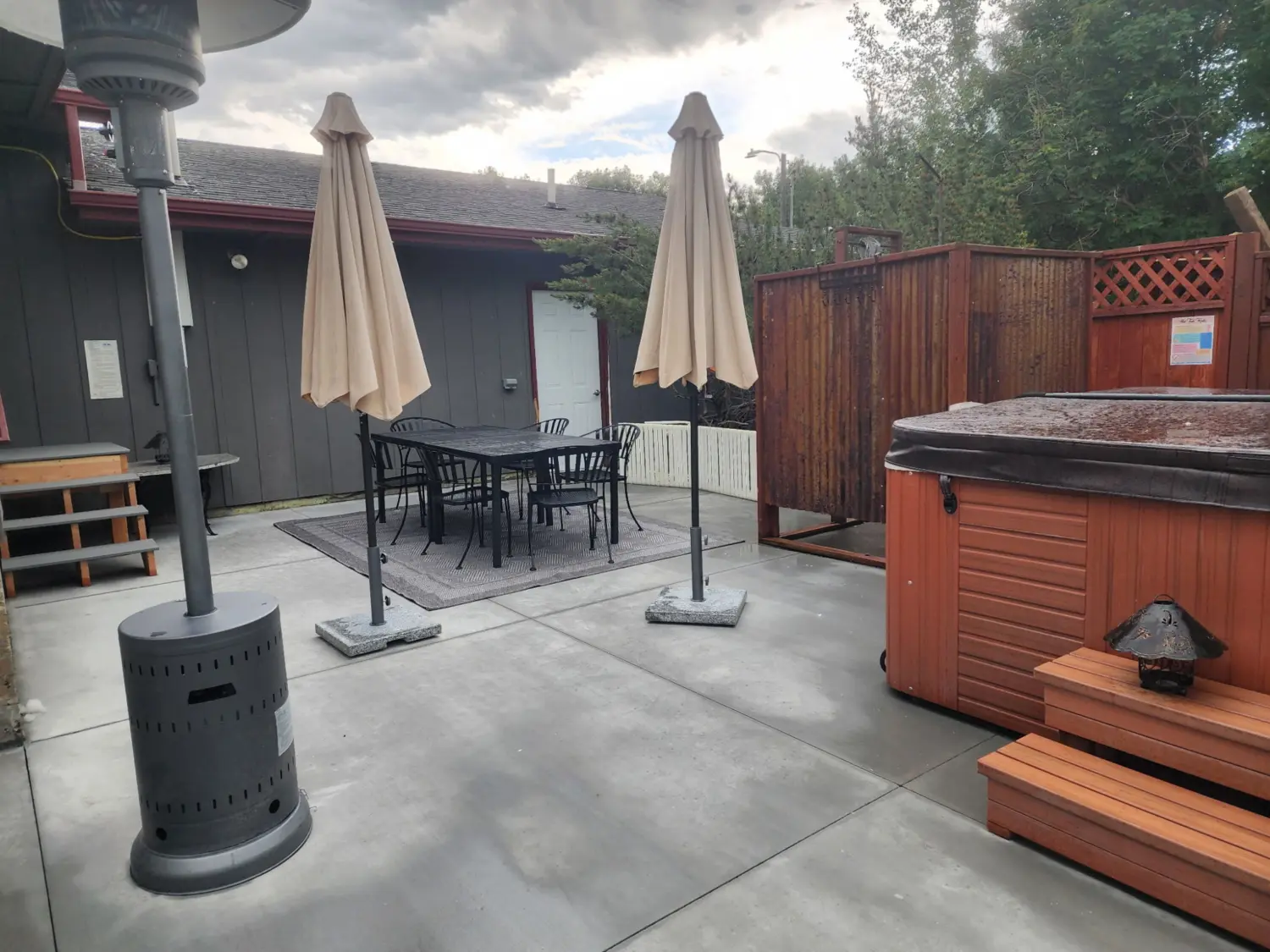 * Hot tub with outdoor shower and privacy fence